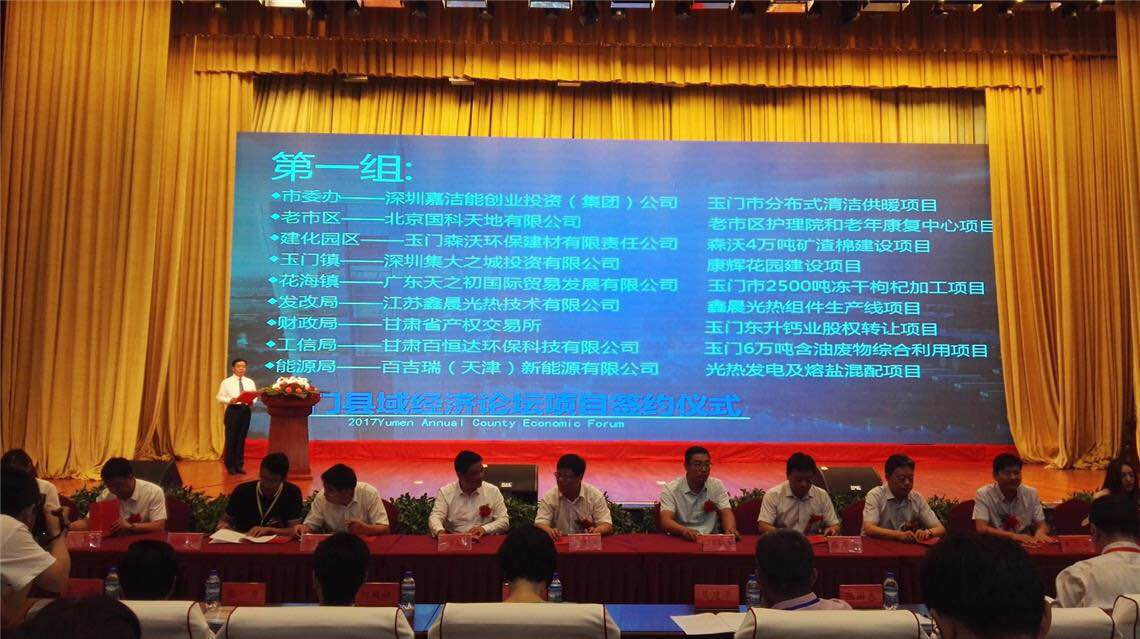 7月26日,在玉门县域经济发展论坛2017年会上,玉门市政府与百吉瑞(天津)新能源有限公司、北京首航艾启威节能有限有限公司、杭州帷盛科技股份有限公司和江苏鑫晨光热技术有限公司分别签订了“光热发电及熔盐混配”、“光热发电定日镜装备制造”、“光热发电及定日镜生产”和“鑫晨光热项目组件生产线”等四个光热发电领域的战略协议。