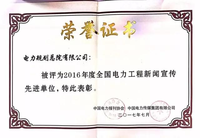 图:电规总院公司荣获“2016年度全国电力工程新闻宣传先进单位”称号