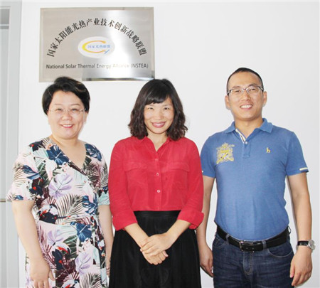 图:中国电力发展促进会可再生能源发电分会秘书长刘映华一行到访国家光热联盟秘书处(图片左起:刘映华、杜凤丽、李瑞峰)
