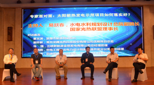 对话由国家太阳能光热联盟理事长、水电水利规划设计总院副院长易跃春主持,敦煌市能源局副局长曹文渊、常州龙腾光热科技股份有限公司战略规划总监窦怀新、三峡新能源金塔发电有限公司总经理助理马强、中电工程西北电力设计院有限公司新能源开发分公司副总经理赵晓辉,启迪爱能首席科学家、清华阳光科技委员会委员曾智勇参加了对话,相关发言内容整理如下,以供参考: