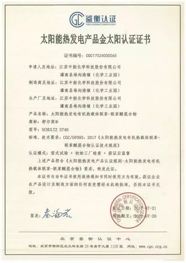 江苏中能化学科技股份有限公司正是依据该技术规范对其太阳能热发电有机热载体联苯—联苯醚混合物产品进行了严格测试。此外,此次认证还对中能科技生产厂进行了工厂检查,包括对企业设计开发、材料采购、工艺策划、生产制造、检验试验、包装贮存、售后服务等各个环节进行了审核,以确保企业的获证产品可以持续满足鉴衡金太阳认证要求。据悉,继中能科技获得首张认证证书后,大连宏海、龙腾光热、中海阳等热发电企业也有意开展认证试点工作。