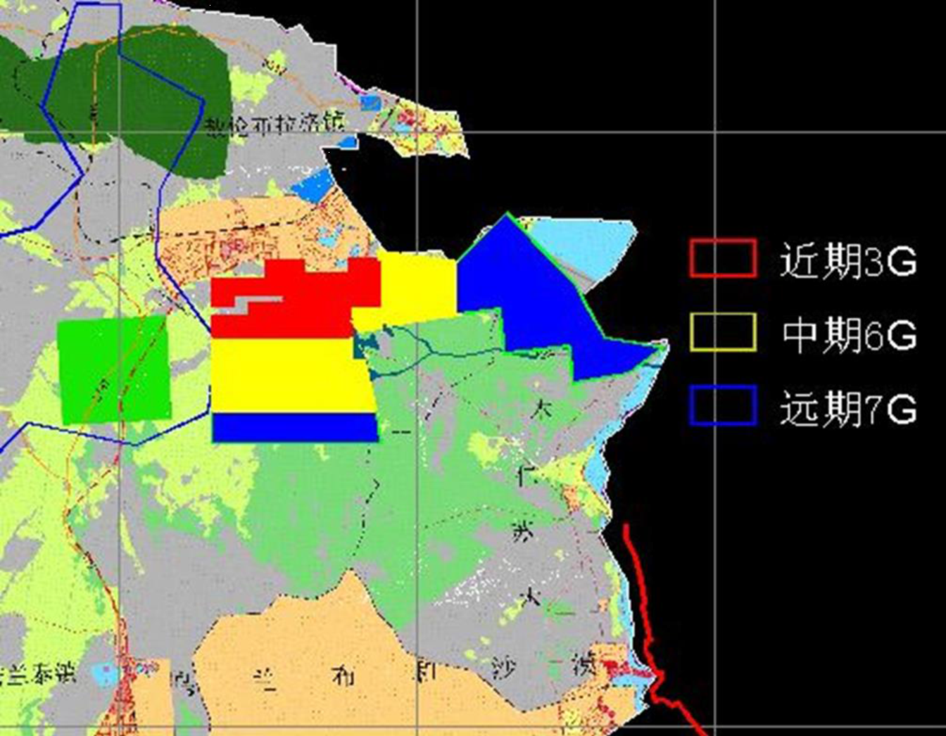 2016年~2020年期间,根据地形及示范基地范围,考虑将自然地形坡度大于2%的场地规划为塔式光热电站,自然坡度小于2%的场地规划为槽式光热电站,因此,在近期规划区域内,中部约143km²用于塔式光热电站,约1.1GW;剩余112km²可用于槽式光热电站,约1.9GW。