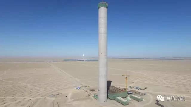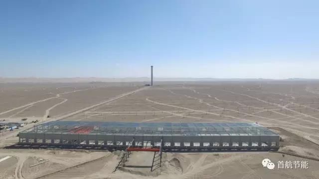 属于国家首批示范光热电站的首航节能敦煌二期100MW塔式熔盐光热项目,吸热塔近期即将完成封顶。二期有全球单机最大的聚光集热镜场—1万多面定日镜基础已完成8000多个,定日镜立柱开始安装,目前定日镜组装车间已经完成封顶,项目预计2018年8月并网发电。