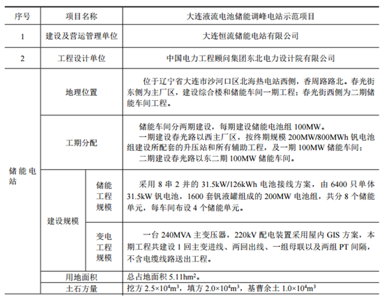 大连液流电池储能调峰电站示范项目拟建设 220kV 全钒液流电池储能站,钒电池容量为200MW/800MWh,分8个储能单元,布置在两个储能车间内, 每个储能车间的电池容量为100MW。同时建设一座 220kV升压站,装设1台容量为 240MVA主变压器,220kV电缆出线 2 回。将北海热电厂全部 200MW 机组与电池储能电站打捆通过2回220kV线路送出,本工程不含线路送出工程。