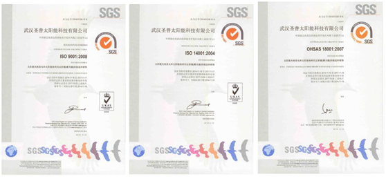 圣普太阳能建立了完善的管理体系,已顺利通过由国际认证机构SGS审核的2015版ISO9001、ISO14001和OHSAS18001三个管理体系认证,全面引进国际一流检测装备,产品通过了DLR和PSA等第三方认可实验室20余项性能质量检测,涵盖光学性能、耐候性、型面精度和机械性能等各方面。