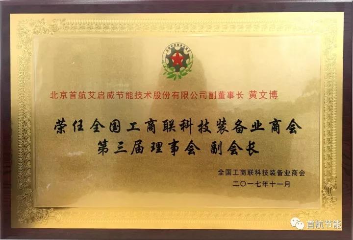 副理事长单位——北京首航艾启威节能技术股份有限公司副董事长黄文博先生当选为商会三届理事会副会长。