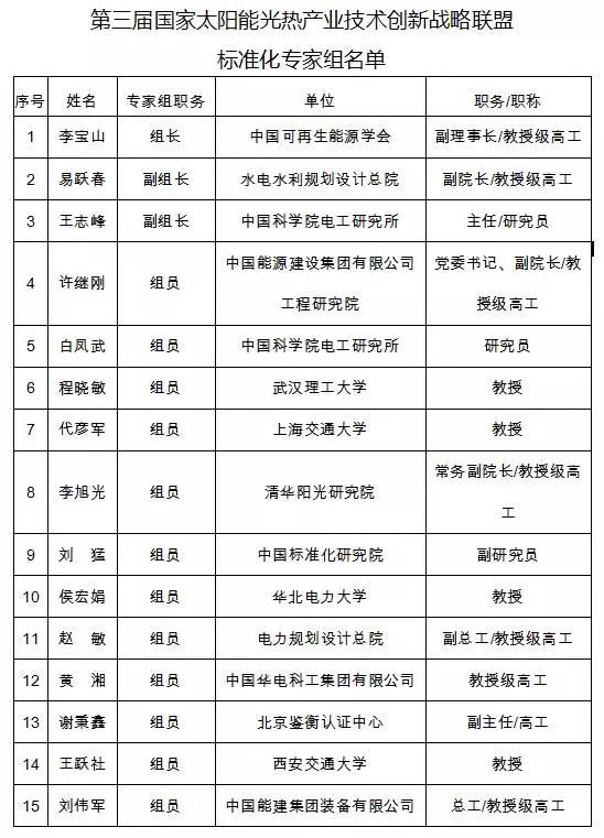 第三届国家太阳能光热联盟标准化专家组共由15人组成,包括太阳能热利用行业内技术专家以及相关标准化工作专家。组长由中国可再生能源学会副理事长、全国太阳能标准化技术委员会主任委员李宝山担任;副组长2名,分别为水电水利规划设计总院副院长、国家能源局能源行业风电标准化技术委员会委员、国家能源局能源行业风电标准化技术委员会委员、风电场施工与安装分标委主任易跃春;中国科学院电工研究所研究员、第一届全国太阳能光热发电标准化技术委员会委员王志峰。