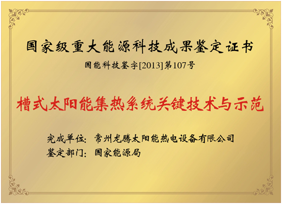 2013年,内蒙古槽式太阳能集热系统关键技术与示范获得“国家级重大能源科技成果鉴定证书”。