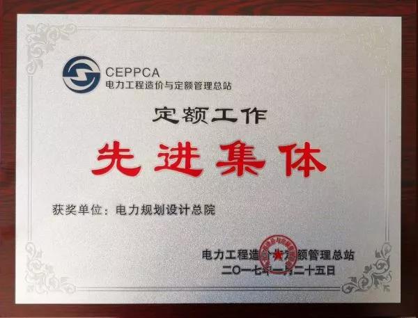 电规总院推选的《太阳能热发电项目造价研究及电价分析》获得2017年电力行业工程造价管理优秀成果奖二等奖,推选的论文《技术进步对电网工程造价水平的影响分析》《电力投资对国民经济发展的量化分析》《生物质气化耦合燃煤发电项目经济型分析》《我国现役亚临界机组节能升级改造技术经济研究》分别获优秀论文一等奖、二等奖。