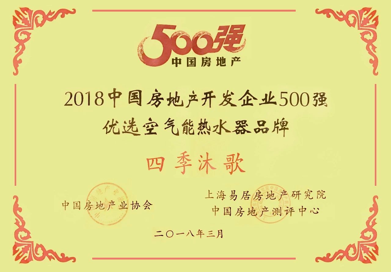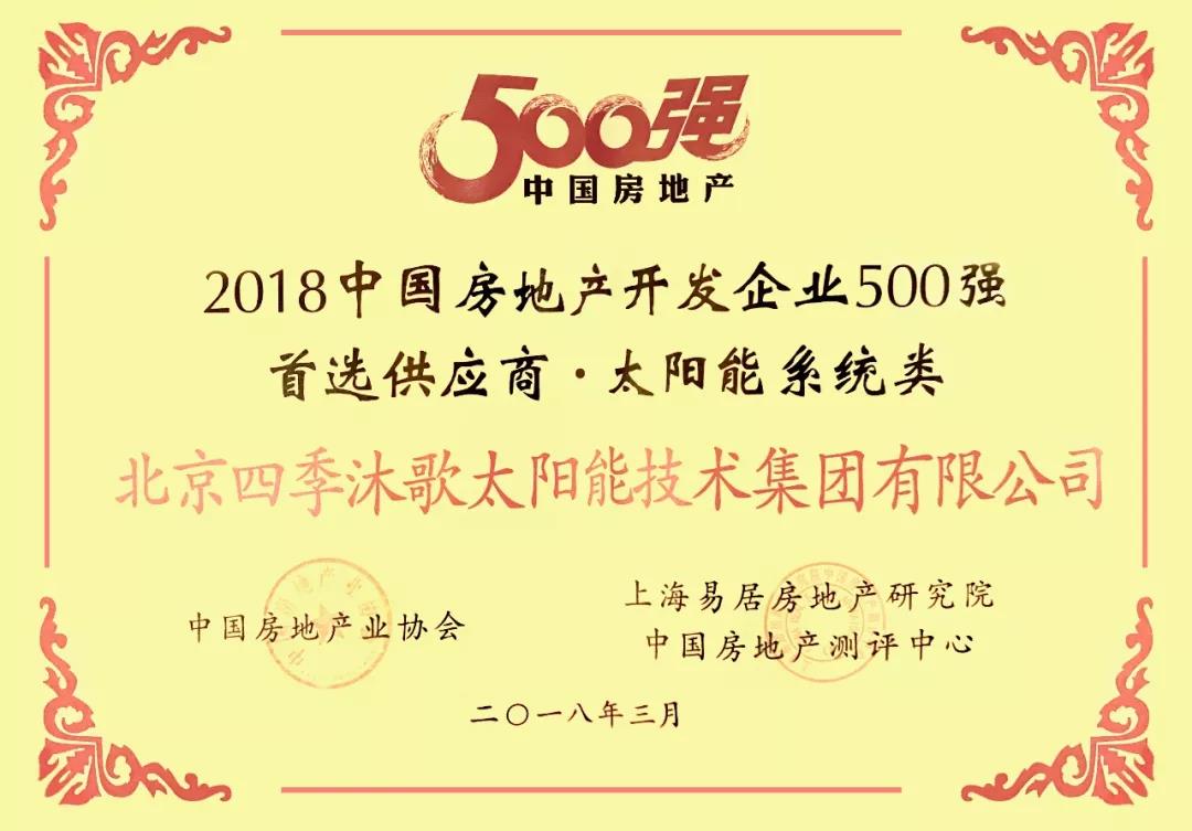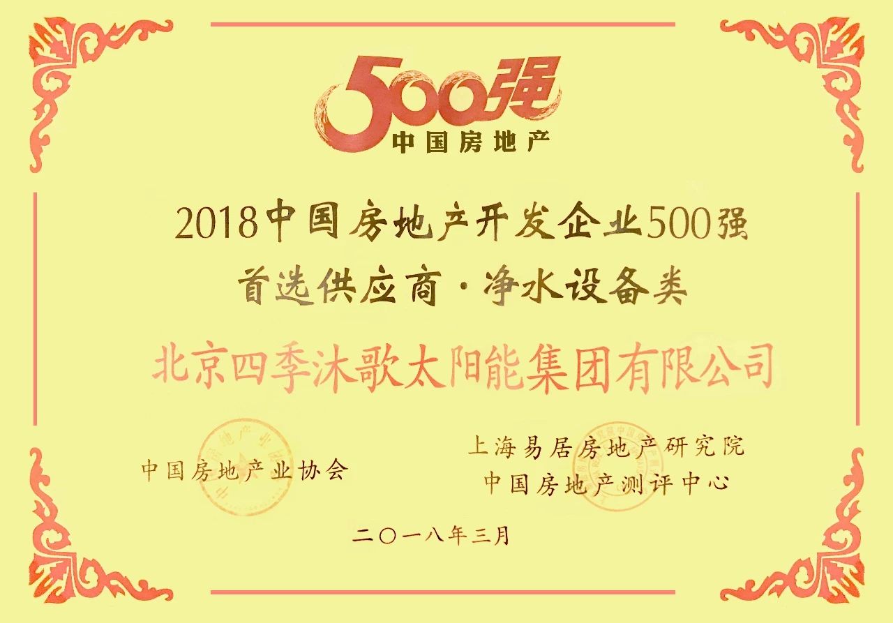 3月21日,2018中国房地产500强测评成果发布会暨500强峰会在北京国贸大酒店盛大举行。在这个备受行业瞩目的高端峰会上,四季沐歌连续第六年获选太阳能系统类“中国房地产开发企业500强首选供应商品牌”、净水设备类“2018中国房地产开发企业500强首选供应商”和“2018中国房地产开发企业500强优选空气能热水器品牌”,成为现场瞩目的焦点。