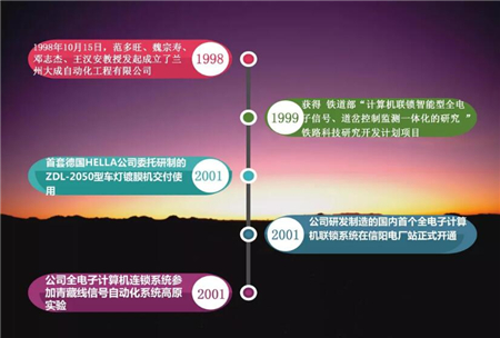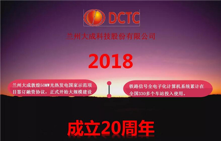 二十年耕耘屡结硕果,四基地同贺再铸辉煌。二十年前的今天,为了更有效地转化和推广科研成果,实现科技强国的梦想,兰州大成科技股份有限公司(简称兰州大成)前身兰州大成自动化工程有限公司在范多旺、魏宗寿、邓志杰、王汉安等四位教授努力下发起成立。历经二十载风雨,兰州大成取得了辉煌的成就,开创了从自动化研究应用到目前铁路信号、真空设备、聚光太阳能三大业务齐头并进的新局面。这条荆棘满途的创新创业道路上,困难和辉煌伴随着大成人一路走来, 二十年里,兰州大成始终秉承着“敢为人先、勇于创新;敢冒风险、勇于竞争;宽容失败、拒绝平庸”的精神。
