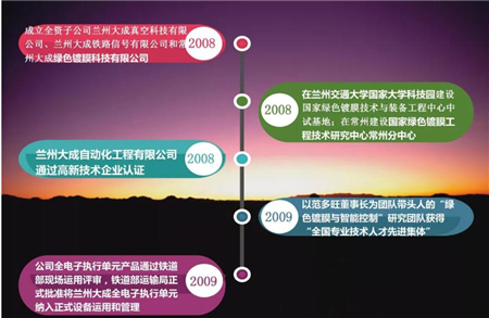 二十年如一日,全体兰州大成人不忘初心,坚持“科技强国,我们有责,我们创新,我们快乐”的创新发展理念;确立了“发展大成,回报股东,成就员工,社会责任”的企业文化;创新实践了产学研用无缝连接的创新机制,和兰州交大一起建成了优秀的“绿色镀膜技术与装备国家工程技术研究中心”,锻炼和培养出了“全国专业技术人才先进集体”和优秀的“教育部长江学者创新团队”,坚持”自主创造核心技术,引领行业技术进步”,引领了表面工程领域近零排放的绿色镀膜和轨道交通领域铁路车站全电子化控制的技术进步。在董事会正确决策和领导下,公司经理班子带领全体员工,团结拼搏,刻苦实干,取得了一系列辉煌成就,在为国家、地区和行业发展做出重要贡献的同时,公司自身实力也得到了很大的提升。