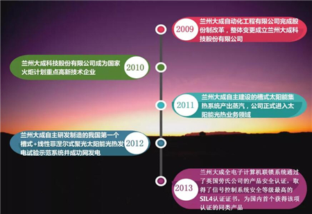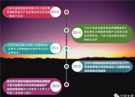2014年12月18日,兰州大成拉萨柳梧新区1兆瓦聚光太阳能热电联产示范项目成功并网发电,兰州大成光热发电业务率先进入商业化运作。