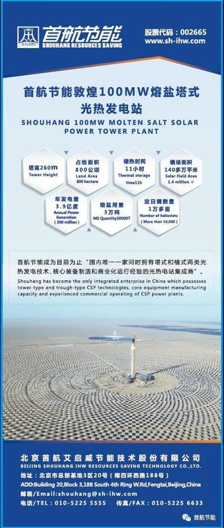 首航节能敦煌100MW熔盐塔式光热示范项目于2018年12月28日正式并网发电。该项目占地面积800公顷,是全球单机聚光规模最大、吸热塔最高、建设周期最短、可24小时连续发电的100MW熔盐塔式光热电站,也是中国首个百兆瓦级光热示范电站,具有完全自主知识产权,标志着我国成为世界上少数掌握百兆瓦级熔盐光热发电技术的国家。
