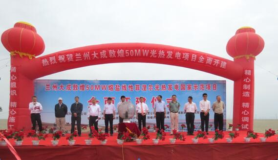 兰州大成敦煌一期5万千瓦熔盐线性菲涅耳式光热发电国家示范项目由兰州大成科技股份有限公司申报,经国家能源局批准(国能新能[2016]223号)入选国家光热发电首批示范项目,且已入选2017年甘肃省省列重大项目,是首批20个示范项目中唯一由甘肃省本土高新技术企业申报并提供核心技术及承担太阳能集热场建设任务的国家光热发电示范项目。项目由兰州大成投资,项目于2017年开工建设。2018年6月,兰州大成与中国电建集团中南勘测设计研究院有限公司签订EPC总承包后,开始全面建设,计划于2019年7月~9月份建成发电。(董清风 报道)