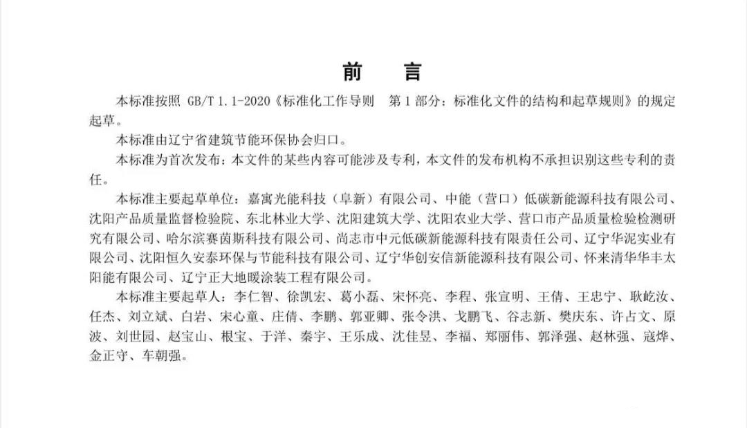 该标准第一起草单位嘉寓光能科技(阜新)有限公司是2021年度加入太阳能光热联盟的理事单位——北京嘉寓门窗幕墙股份有限公司的子公司。据悉,阜新地处辽西北,每年城市取暖期长达5个月,农村取暖周期普遍超过半年。2020年,嘉寓光能科技(阜新)有限公司落户阜新后,在阜新市委、市政府大力支持下,致力于推广清洁取暖这一全新的生活方式。在阜新蒙古族自治县王府镇、彰武县彰武镇等地,选取部分农户安装了“光热+绿电”清洁取暖系统。据2021年8月5日嘉寓股份发布的公告,嘉寓光能科技(阜新)有限公司中标15.9亿“光热+”清洁能源采暖项目,将在阜新市所辖阜新县、彰武县、海州区、太平区、细河区、高新区、新邱区等地推广“光热+”清洁取暖、清洁能源热水项目。作为集研发、设计、生产、施工于一体的建筑节能、智能、光热光伏、门窗幕墙系统提供商,嘉寓股份努力做到清洁供暖,温暖万家。(详情链接:“光热+”点燃业务增长“新引擎”,嘉寓股份加入太阳能光热联盟)