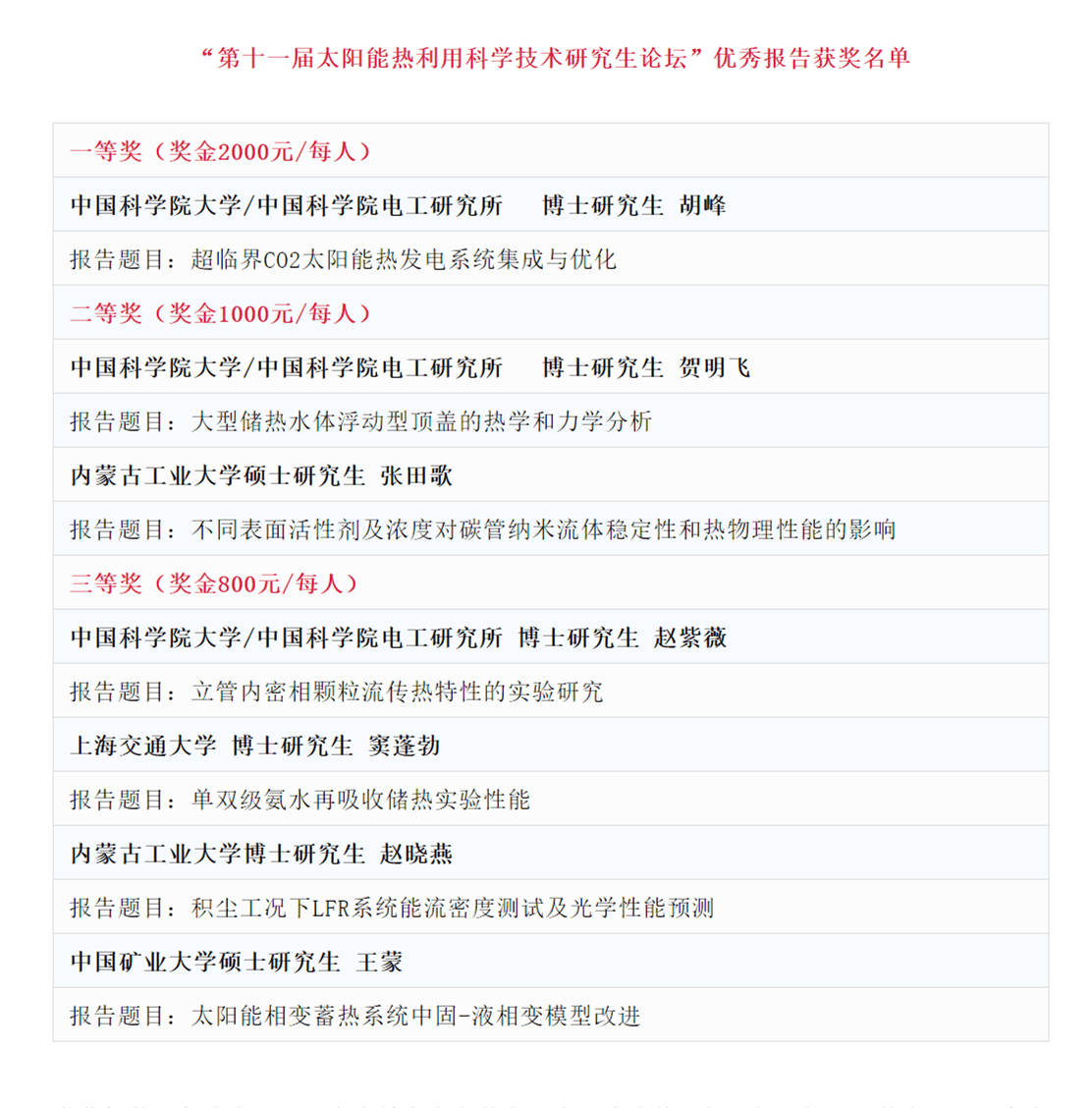 为鼓励研究和创新,本届研究生论坛共邀请了6位来自不同高校的教授作为评委,从研究生们的报告内容以及口头表达等方面进行了打分。经过严格的计票、唱票和监票流程,太阳能光热联盟秘书处对研究生报告的得分情况进行了统计,并按照得分高低得出了本届论坛的优秀报告获奖者。获奖研究生将分别获得由“德芳太阳能热利用奖学金”资助的奖金。