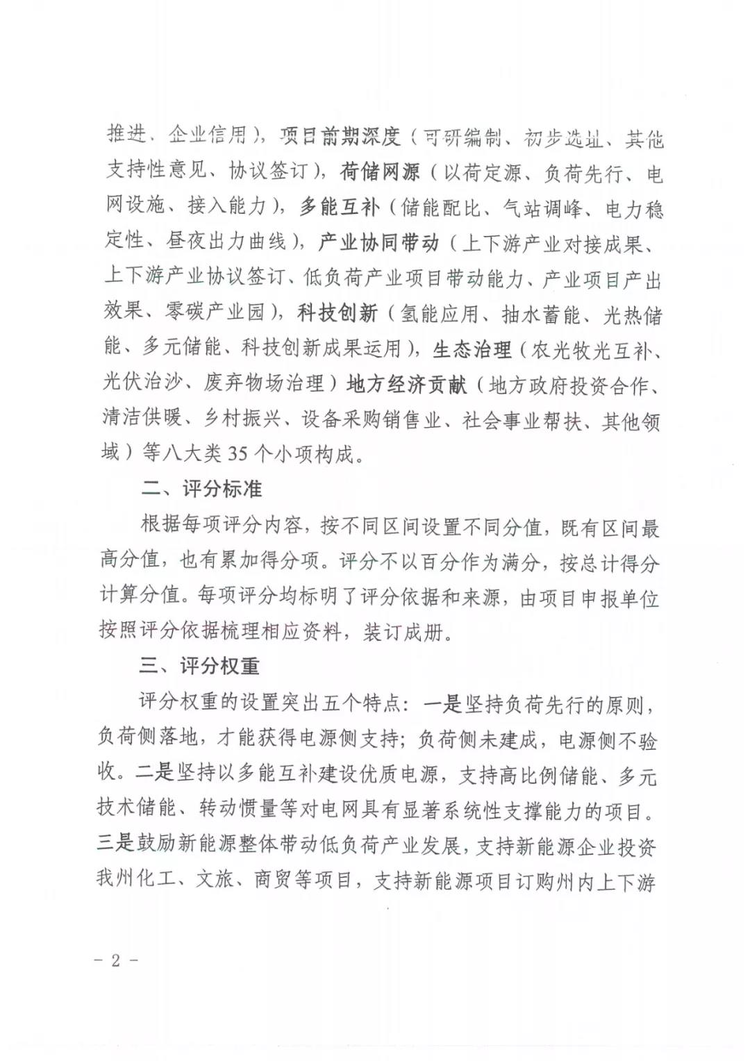 评分权重设置了五个突出点,一是负荷先行,负荷侧落地才能获得电源侧支持,负荷未建成则电源不验收;二是以多能互补建设优质电源;三是鼓励新能源投资化工、文旅、商贸等项目,支持采购州内产品;四是突出氢能和光热应用;五是支持新能源企业与政府投资公司深度合作,促进建筑、服务、金融的发展。