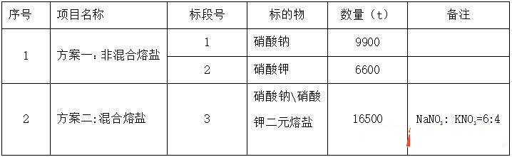 据公告,本次招标范围包括:玉门鑫能光热第一电力有限公司50MW熔盐塔式光热发电项目所需的二元硝酸盐(硝酸钠、硝酸钾)采购,硝酸钠9900吨,硝酸钾6600吨。本项目此次采购分两种方案,方案1为非混合熔盐,标的物为硝酸钠9900t,硝酸钾6600t;方案2为混合熔盐,标的物为硝酸钠/硝酸钾二元熔盐16500t(具体要求详见技术规范书)。