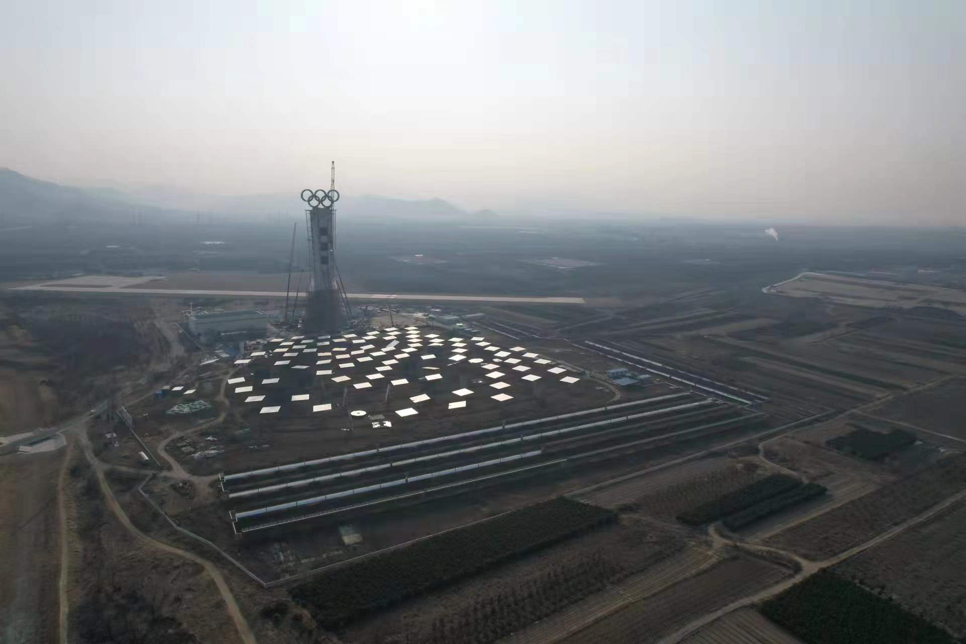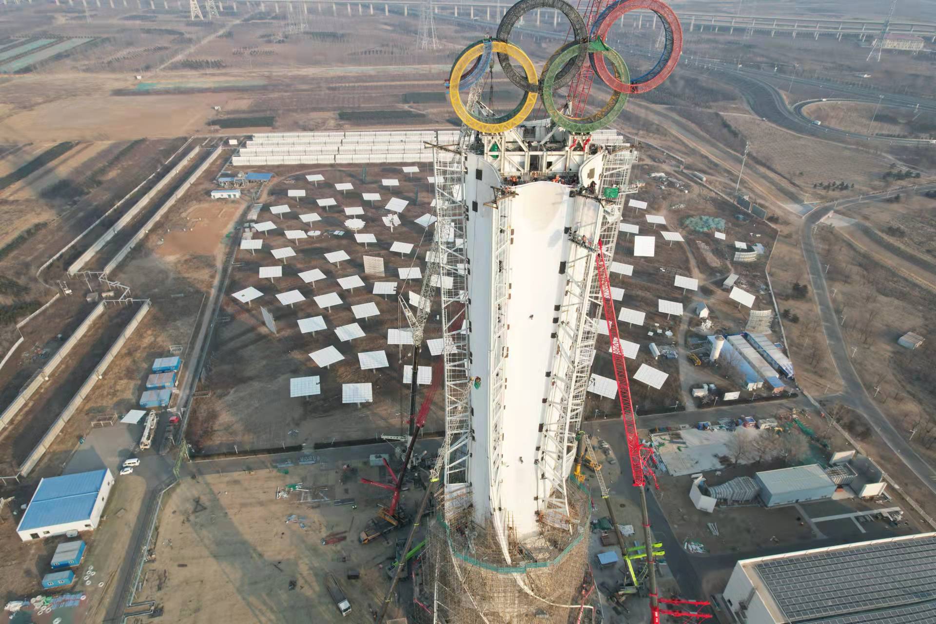 “奥运五环”标志塔位于延庆太阳能发电研究基地场区内,在原八达岭太阳集热试验塔上改造设计完成,驾车行经京礼高速前往延庆赛区的路上就能远远看到。