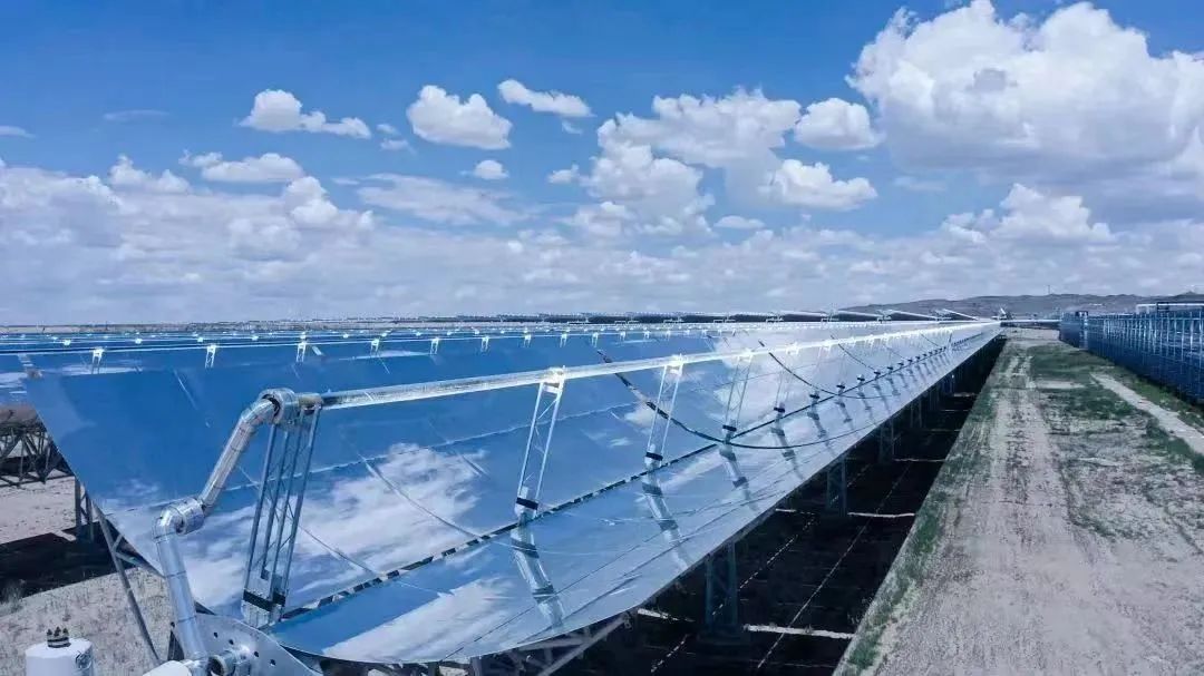 在中船新能源内蒙古乌拉特中旗导热油槽式100兆瓦光热发电示范项目区内,一片片反射镜汇成“蓝海”,在阳光下熠熠生辉,一个个槽式集热器整齐傲立,指引航程,形成了一道亮丽的风景线。中船新能源100兆瓦光热发电示范项目是国家首批光热示范项目中单体规模最大、储热时长最长的槽式光热发电项目,项目可实现24小时连续发电,1月份发电约0.1亿度。