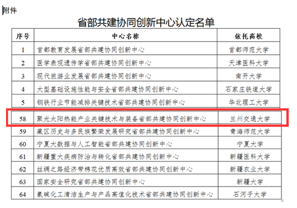 9月24日,教育部办公厅印发了《关于认定2019年度省部共建协同创新中心的通知》,全国共认定64个省部共建协同创新中心,兰州交通大学王成龙教授团队申报的“聚光太阳能产业关键技术与装备省部共建协同创新中心(下文简称协同创新中心)”榜上有名。这标志着协同创新中心从原有的“甘肃省2011协同创新中心”升级为国家级科研平台,成为甘肃省高校中继兰州大学后第二个被教育部认定的省部共建协同创新中心。