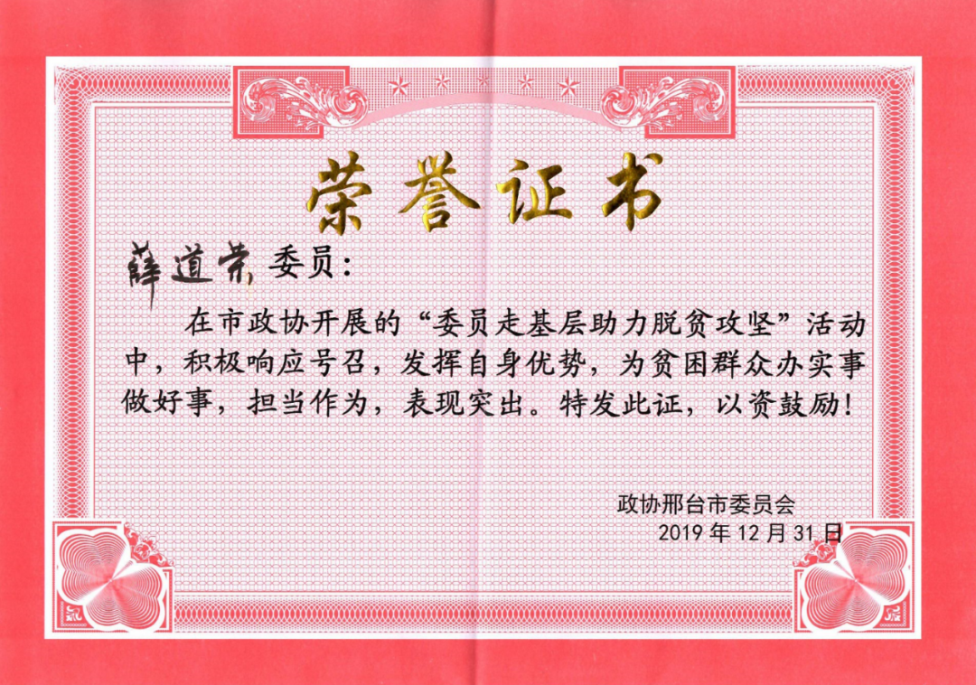 薛道荣同志对“委员助力脱贫攻坚”行动的全力支持、倾力投入,在产业、就业、科技、公益扶贫等方面都取得了一定成效,受到了党委政府的肯定和干部群众、社会各界的好评。现经市政协各专委会、市各民主党派、工商联推荐,另根据注重实际、好中选优、群众公认的原则,薛道荣同志等在助力脱贫攻坚行动中表现突出的市政协委员获得了通报表扬。