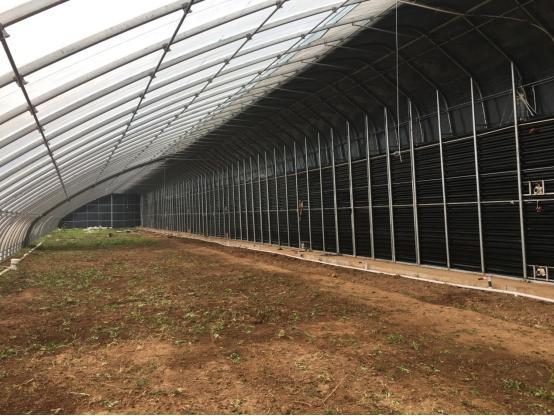 目前该项水模块化主动蓄热日光温室属全国首例,因施工建设不需要砖块等土建材料,适合于平原土资源缺乏、因雨水过多易损坏大棚墙体的区域、旧棚改造的冬季寒冷地区大棚。