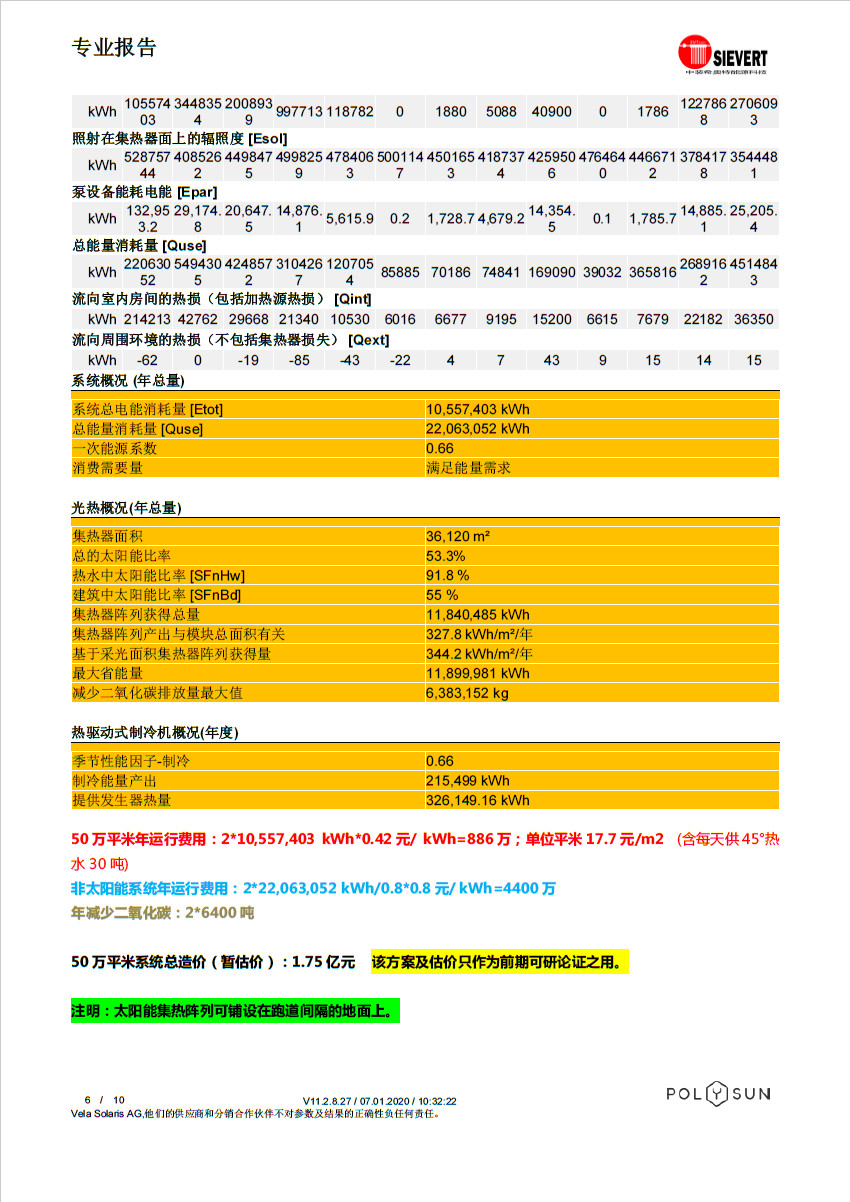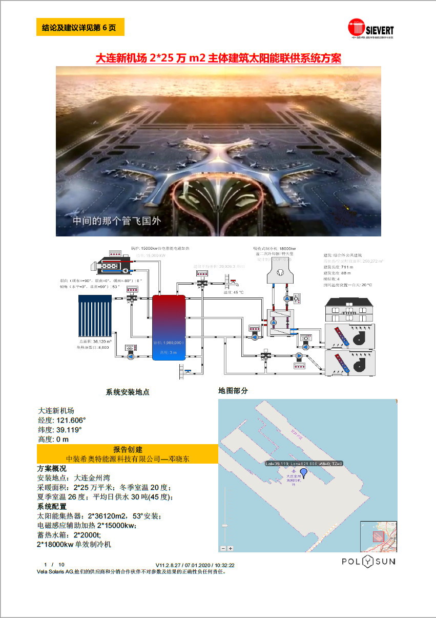 建筑太阳能联供系统技术方案提供商——深圳市中装希奥特能源科技有限公司(下文简称中装希奥特)将为大连金州湾新机场2*25万平米建筑,提供了“太阳能联供系统”技术方案。系统配置了太阳能集热器:2*36120㎡,53°安装;电磁感应辅助加热:2*15000kw;蓄热水箱:2*2000t; 2*18000kw单效制冷机。冬季室温20℃,夏季室温26℃,平均日供水30吨(45℃),年减少二氧化碳:2*6400吨。