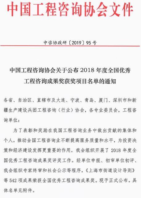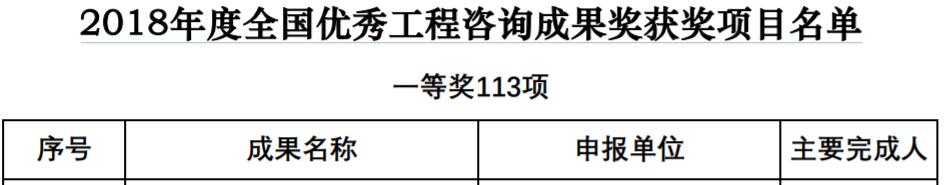 据了解,2018年度全国优秀工程咨询成果奖由中国工程咨询协会组织开展,旨在表彰和奖励在我国工程咨询业务中做出突出贡献的集体和个人,从而推动全国工程咨询业务服务质量和服务水平不断提升。经单位申报、初审单位初评、中国工程咨询协会专家终审和社会公示等程序,共评选出各类奖项成果542项。