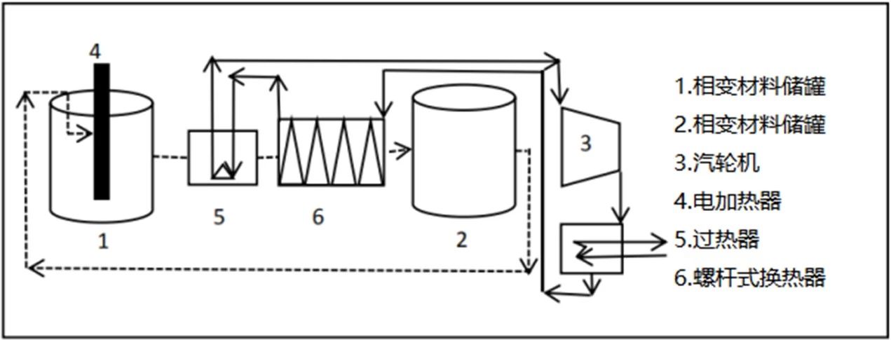 技术1 利用电厂谷电弃电加热相变材料,将电能转化为热能,以热能形式储存于相变材料罐中,峰电时段,相变材料在螺杆式换热器中发生相变,利用相变焓加热水变成蒸汽,利用过热器使相变材料加热饱和蒸汽,由过热蒸汽推动汽轮机发电。在相变材料储罐2中,相变材料转化为固体,并传送至相变材料罐1,从而达到运用相变材料回收弃电,利用谷电的作用。此技术利用了蒸发焓大的水作为传热介质,提高了能量的利用率,同时所用相变材料具有相变焓较大特点,利用了显热段与潜热段,可以大大减少了罐体体积。
