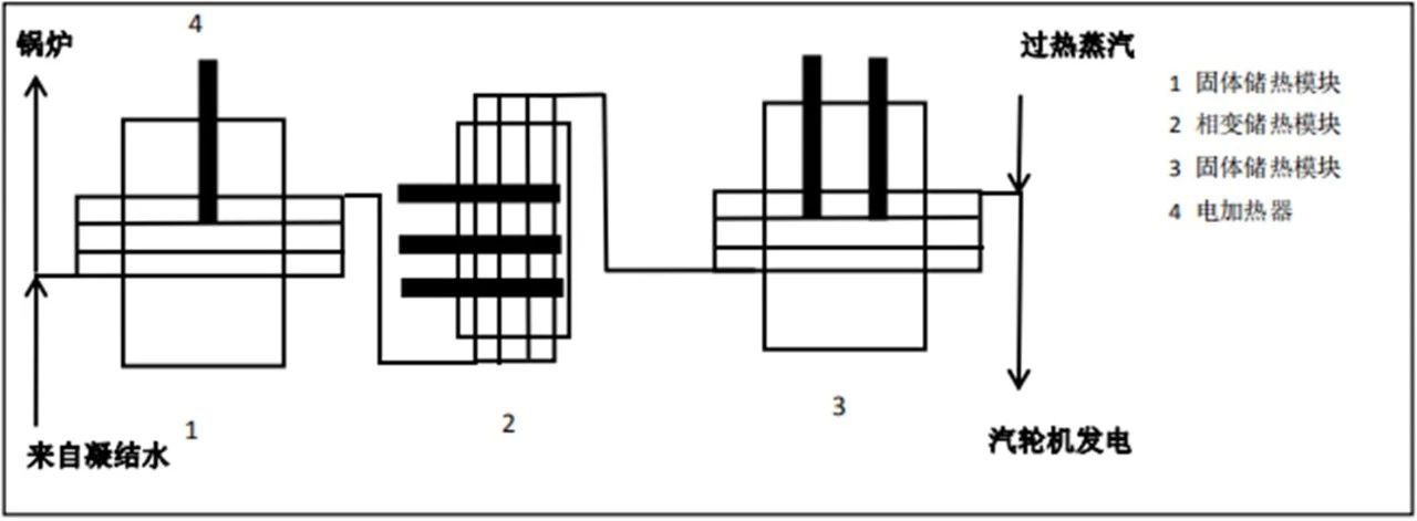 技术2 在谷电时段,将多余过热蒸汽依次通过固体储能模块、相变储能模块、固体储能模块后进入锅炉,此过程相变材料储存能量,储能模块中均加入与电厂谷电或弃电连接的加热器,以此达到利用谷电弃电的作用;在峰电时段,凝结水通过相变材料,相变材料放出热量,使凝结水转化为过热蒸汽使汽轮机发电,达到运用相变材料回收弃电,利用谷电的作用。此过程分段储能,利用了显热和潜热段能量,运用蒸汽直接储能,提高了能量运用效率。