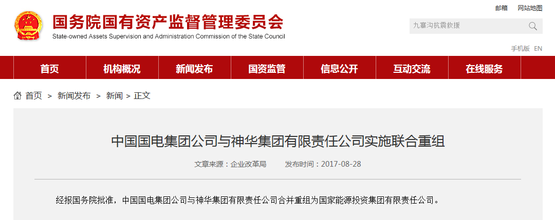 2017年8月28日,据国务院国有资产监督管理委员会官网公布,经报国务院批准,中国国电集团公司与神华集团有限责任公司合并重组为国家能源投资集团有限责任公司。