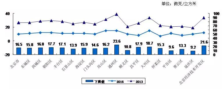 北京市2016年细颗粒物(PM2.5)年均浓度为73微克/立方米,比2013年下降了22.6%。全市二氧化硫(SO2)浓度则降至10微克/立方米,与2013年比降幅达到62.3%。按含硫量1%计算,1吨民用型煤燃烧会产生16千克左右SO2,1.5千克左右的烟尘。2013-2016年,居民生活用煤减少68.4万吨,减少SO2排放10944吨,烟尘排放1026吨,为北京市空气质量的提高做出了贡献。随着供暖季来临,煤改清洁能源工作的效果将进一步得到验证。