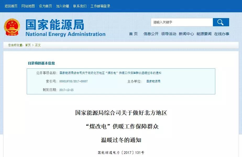 国家能源局近日发布《关于做好北方地区“煤改电”供暖工作保障群众温暖过冬的通知》。