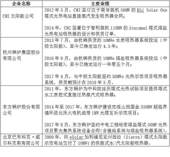 国产供应商方面,经过近年来积极参与一些试验项目和首批光热示范项目,东方锅炉和杭州锅炉、首航节能等企业也在逐步崛起,在积累了一定项目业绩的同时,也研发出了拥有自主知识产权的吸热器制造技术并不断进行优化和创新。