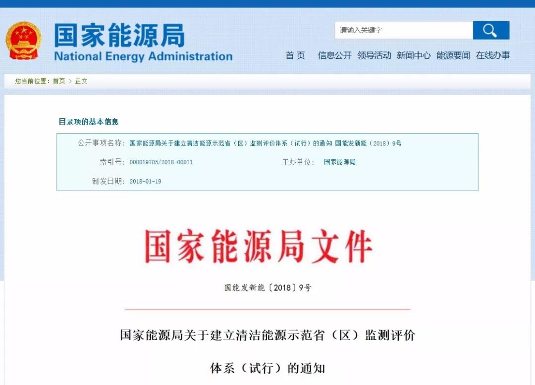 国家能源局2018年2月6日发布《关于建立清洁能源示范省(区)监测评价体系(试行)的通知》,通知指出,为促进全国清洁能源示范省(区)持续健康发展,加强清洁能源示范省(区)建设及运行情况的事中事后监管,总结各地成功经验和工作方法,决定建立清洁能源示范省(区)建设运行情况监测评价体系。