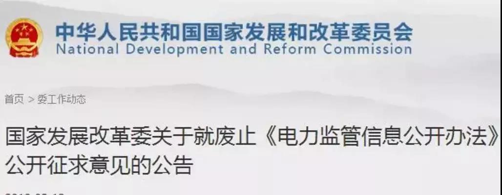 近日,国家发改委发布了关于就废止《电力监管信息公开办法》公开征求意见的公告,详情如下: