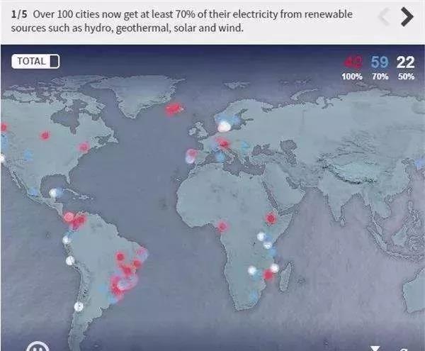 此外,据统计,275个城市正在使用水电,而189个城市正在使用风力发电,184个城市正在使用太阳能光伏发电。