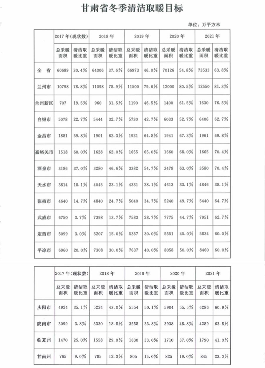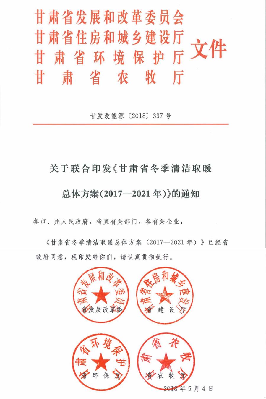 5月21日,甘肃省发展改革委、省建设厅、省环保厅、省农牧厅联合公布《甘肃省冬季清洁取暖总体方案(2017-2021年)》,指出甘肃省将以示范先行,有序推进为原则,以居民可承受为中心,指导各地选取适宜清洁供暖策略,积极开展电供暖、热泵取暖、可再生能源分布式供热、空气热能、工业余热采暖等示范试点。全面、分类、有序推进各地清洁取暖,重点布局城郊及县城、积极带动农村地区。