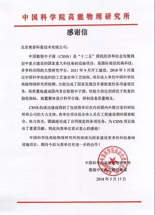 近日,奥普科星收到了中国科学院高能物理研究所发来的感谢信,在致奥普科星的感谢信中说:CSNS项目按期、全面完成了国家发改委批复的各项建设任务,高质量地建成国内首台散裂中子源,性能全部达到或优于批复的验收指标,装置整体设计科学合理,研制设备质量精良。CSNS的成功建成,得到了包括奥普科星在内的国内外数百家科研院所和公司的大力支持,奥普科星项目组全体人员在工程建设期间紧密配合、协力攻关,圆满地完成了合同规定的各项任务,为CSNS项目作出了重要贡献,特此向奥普科星表示衷心的感谢,并期待今后有进一步的合作。