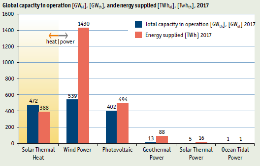 报告显示,截至2017年底,全球大型太阳能热利用系统数量达到296个,其集热面积达1,741,344平方米(1.2GWth)。由于这只占全球总容量的0.3%,显然还有很大的增长潜力。