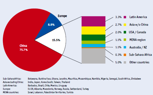 图:世界区域新增装机容量比例(包括有盖板和无盖板的太阳能热水和空气集热器):中国和欧洲再次成为全球最大的市场。