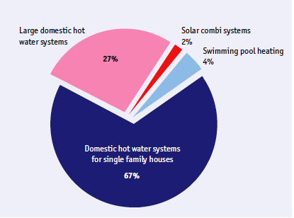 图:多家庭住宅,酒店和学校的太阳能热能产出占全球总太阳能热量产出的27%。单户住宅的太阳能热水器市场略有下降。游泳池加热和太阳能组合系统是利基(niche)市场。