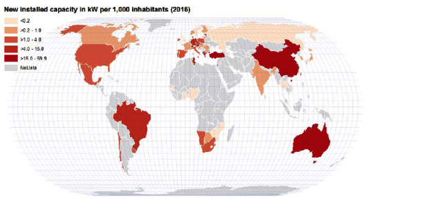 太阳能采暖和制冷是一项全球性业务:暗红色区域市场中每千人拥有最高的新装机容量。
