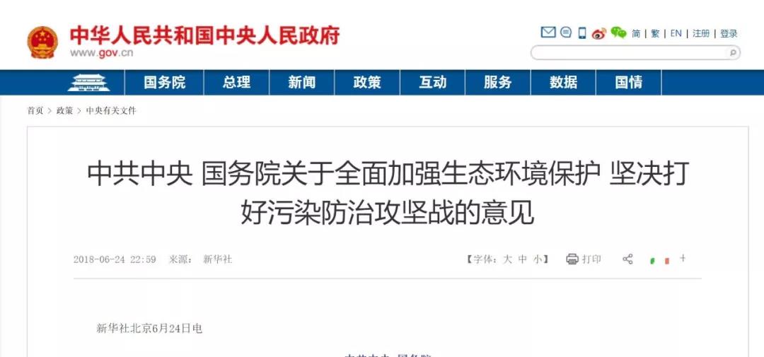 2018年6月16日, 国务院印发《关于全面加强生态环境保护 坚决打好污染防治攻坚战的意见》。