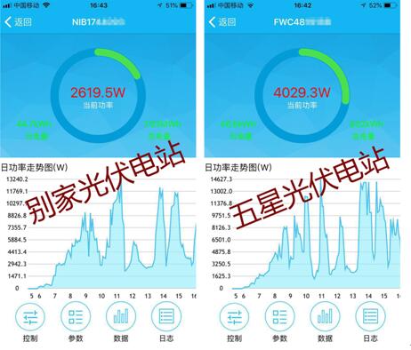 今年5月底,厚街镇的尹先生家里也安装了一台13.68kw的五星双玻光伏电站,并且在6月12日完成并网。尹先生是个特别细心的人,出于对光伏电站的好奇,同时也想验证一下电站的质量和发电量,他特意做了个小试验:选择了同行业的另外一家规格大小、装机容量一致的光伏电站,与自家的光伏电站进行了PK。这本是件无心之事,谁知最后他竟发现了一个大秘密:通过对两家电站发电量的持续对比,发现五星双玻光伏电站确实发电要多点!为证明所说非虚,他还特意向小编展示了两家电站的当天发电量截图。