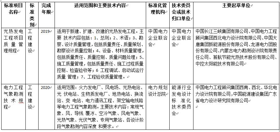 标准制(修)订计划其中包括“光热发电工程项目质量管理规程”。该标准要求在2019年完成;