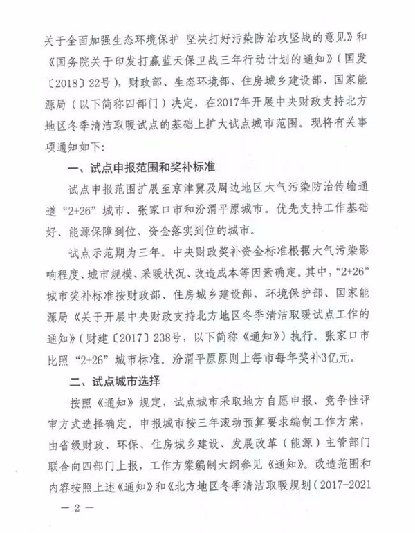 新近发布的这则通知将试点申报范围扩大至京津冀及周边地区大气污染防治传输通道“2+26”城市、张家口市和汾渭平原城市。其中,“2+26”城市按2017年上述文件要求执行,张家口市比照“2+26”城市标准,汾渭平原原则上每市每年奖补3亿元。