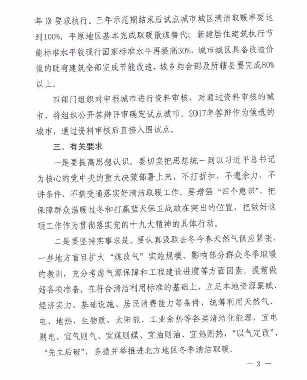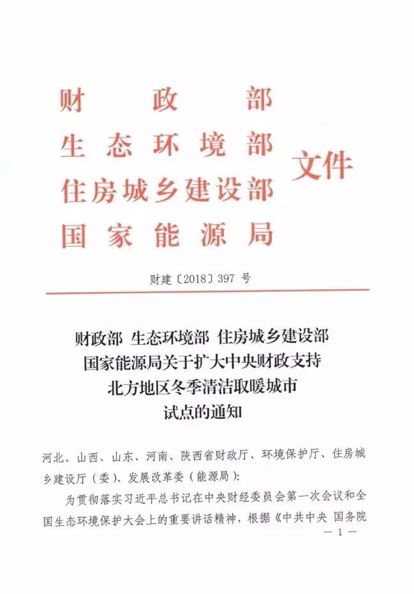 此前的2017年5月16日,财政部、住房城乡建设部、环境保护部、国家能源局发布《关于开展中央财政支持北方地区冬季清洁取暖试点工作的通知》,天津、石家庄、唐山、保定、廊坊、衡水、太原、济南、郑州、开封、鹤壁、新乡等12个城市最终纳入2017年北方地区冬季清洁取暖试点范围。